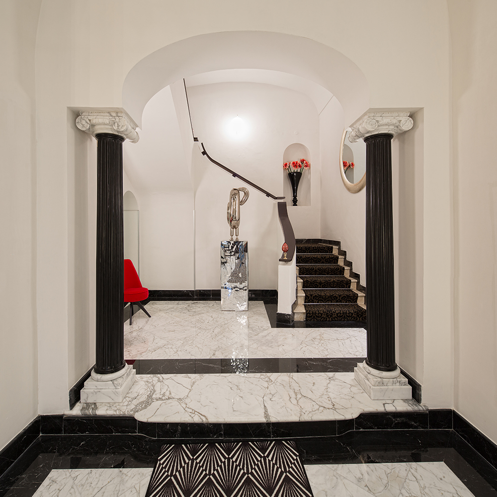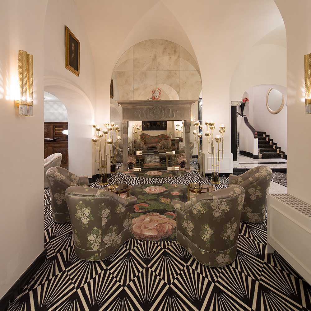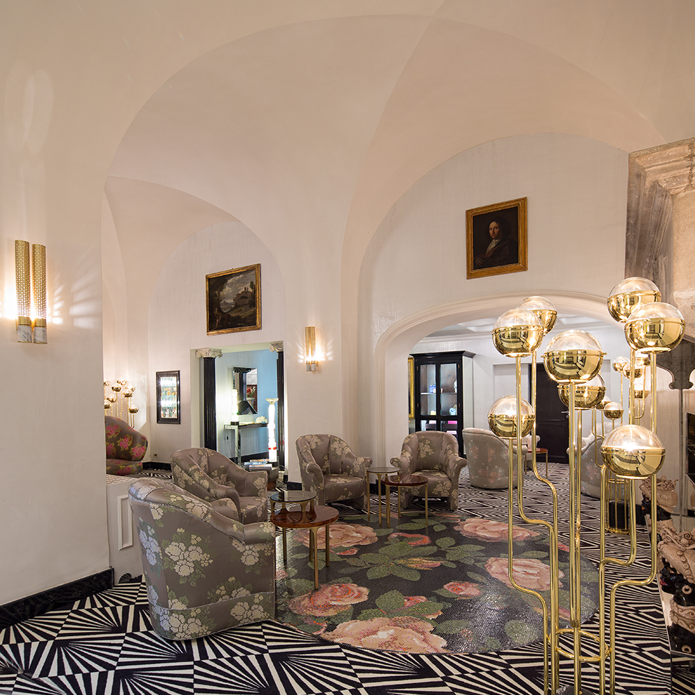 The lobby finds inspiration in the rose garden of Countess Manfredi, a figure whose memory, taste and regal hospitality echoes everywhere. The triumph of old-fashioned chandeliers and light points, the Hoffman armchairs, the large mirror, the 1940s black-and-white carpet and the “Bouquet of Roses Bisazza” mosaic rug are proof of this.