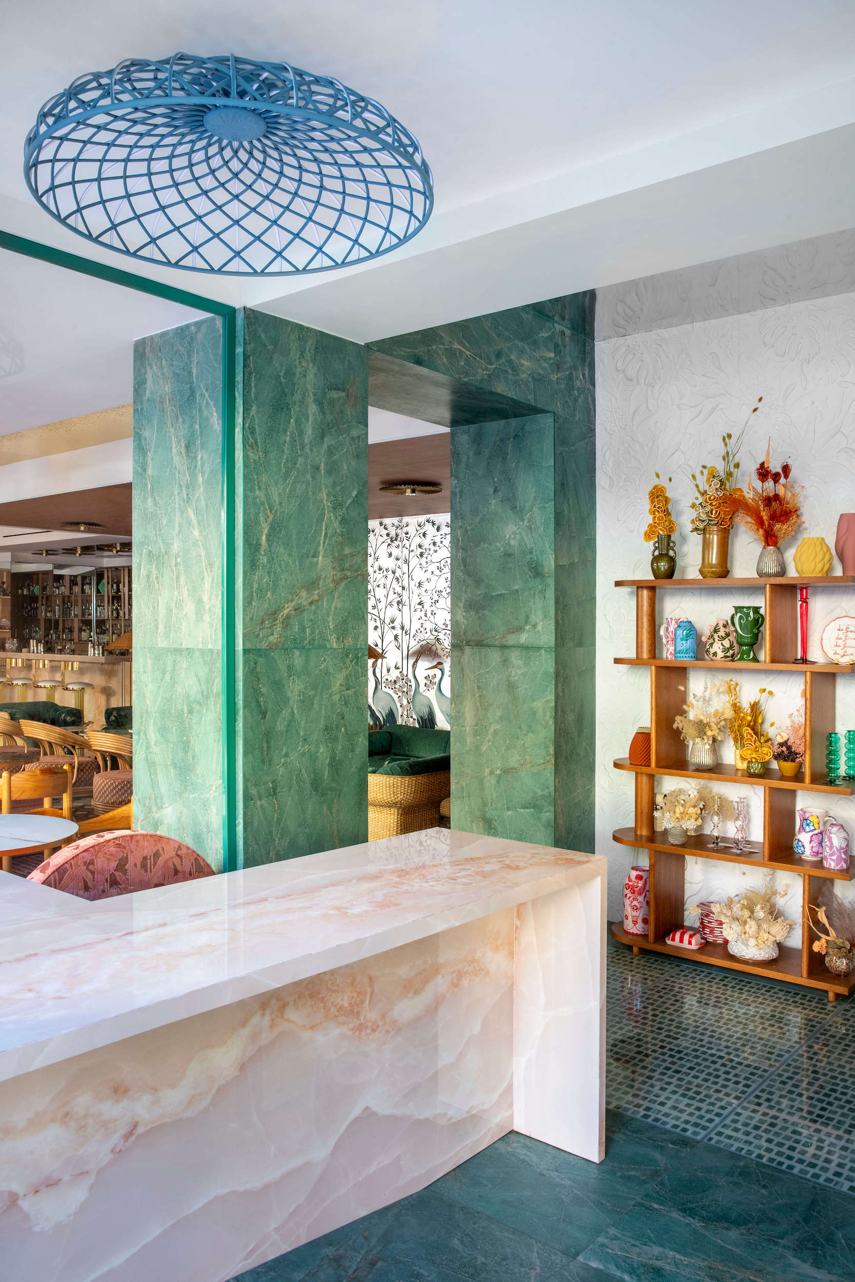 In front of the windows, the art of Irem Incedayi adorns the central wall of the lounge area. Majestic birds and exotic vegetation mix on the backdrop made of silver leaf, creating an almost dreamlike mood. Adhesive mirrors positioned specifically on the ceilings and walls generate artificial depths and direct the light above the entrance as well as above the pink onyx cocktail bar counter.