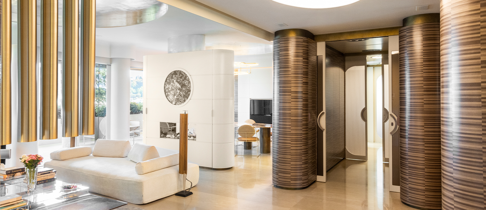 Linee continue e circolari, trasparenze, interior su misura. Casa Farnesina riassume rigore e fluidità in 220 mq al terzo piano di un palazzo del noto quartiere romano, a poca distanza dalla sede del Ministero degli Affari Esteri. Il proprietario, un imprenditore con grande passione per la nautica, ha lasciato un tessuto grezzo da modellare a propria scelta, un open space con le sole colonne a sostenere struttura e fantasia. Loto ad Project interviene superando lo schema tradizionale della suddivisione degli spazi e impronta la progettazione come fosse un pied dans l’eau, senza spigoli vivi, sofisticato e su misura.