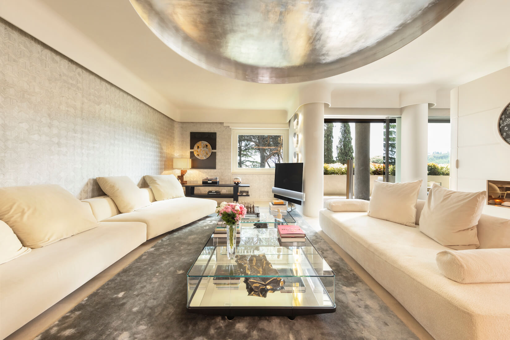 Quest’anima a guscio trova la sua naturale sponda nei soffitti, su cui vengono scavati grandi plafoni trattati con foglia d’argento per riflettere la luce e marcare la rotondità di tutto il progetto.