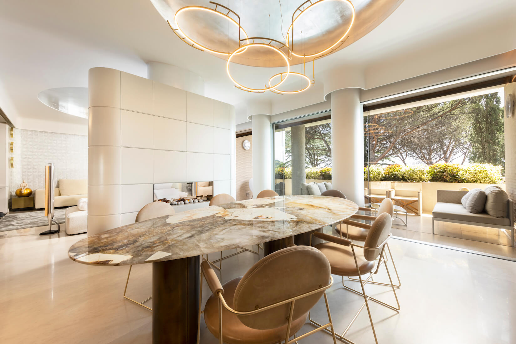 Abbiamo ottimizzato gli ingombri pensando alla vita a pelo d’acqua, studiando e realizzando grandi pillole e armadi che servono da quinte per separare funzioni e ambienti, come quella nella sala che incamera anche il camino e dove spiccano come assoli in un’orchestra i divani Absolu e Sherazade di Edra davanti a un raffinatissimo tavolo basso di Glas. Per il convivio invece, tavolo e sedie firmati Baxter. Unica nota scura la consolle Daytona.
