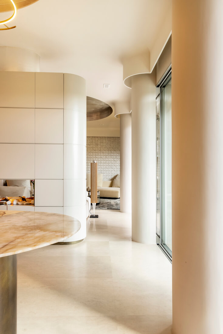 Linee continue e circolari, trasparenze, interior su misura. Casa Farnesina riassume rigore e fluidità in 220 mq al terzo piano di un palazzo del noto quartiere romano, a poca distanza dalla sede del Ministero degli Affari Esteri. Il proprietario, un imprenditore con grande passione per la nautica, ha lasciato un tessuto grezzo da modellare a propria scelta, un open space con le sole colonne a sostenere struttura e fantasia. Loto ad Project interviene superando lo schema tradizionale della suddivisione degli spazi e impronta la progettazione come fosse un pied dans l’eau, senza spigoli vivi, sofisticato e su misura.