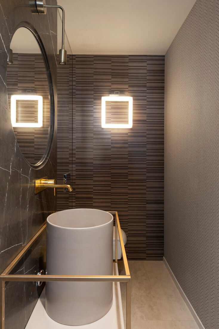 La preziosità dei materiali torna nel bagno attiguo alla camera padronale, un ambiente dal mood più rigoroso e maschile le cui superfici vengono in rilievo orizzontalmente.