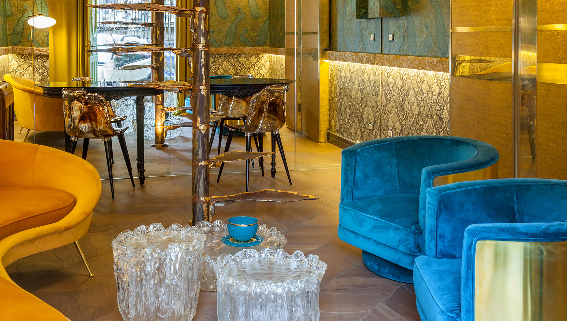 Le applique belghe originali anni ’30 sono accostate a pezzi di design contemporaneo, come la lampada Mirage di Slamp, i divani disegnati da Loto Ad Project e realizzati con tessuti Rubelli, i tavolini Fountain Glas Italia, le sedute Gilda di Edra e il vaso di Elena Salmistraro per la manifattura Bosa. Due scrittoi di ispirazione liberty di Mogg completano lo spazio.