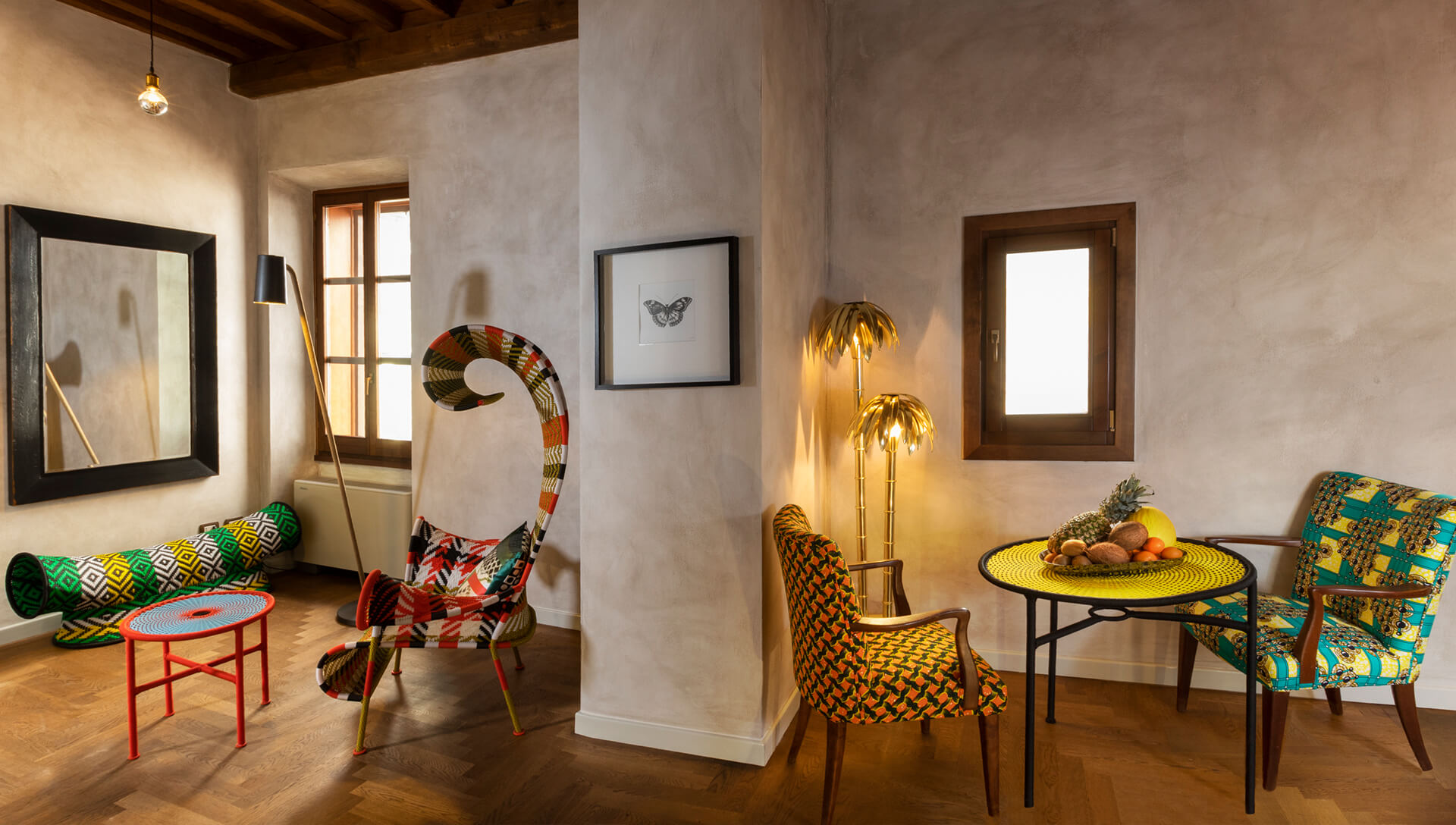 Leit motif del progetto, che accomuna tutte le suites, è la palma, albero presente a Roma già ai tempi di Svetonio, diventata pianta alla moda sul fine Ottocento e poi in epoca fascista, quando durante il periodo coloniale l’Italia amava addobbarsi in stile africano per ricordare i suoi fasti e le sue conquiste.