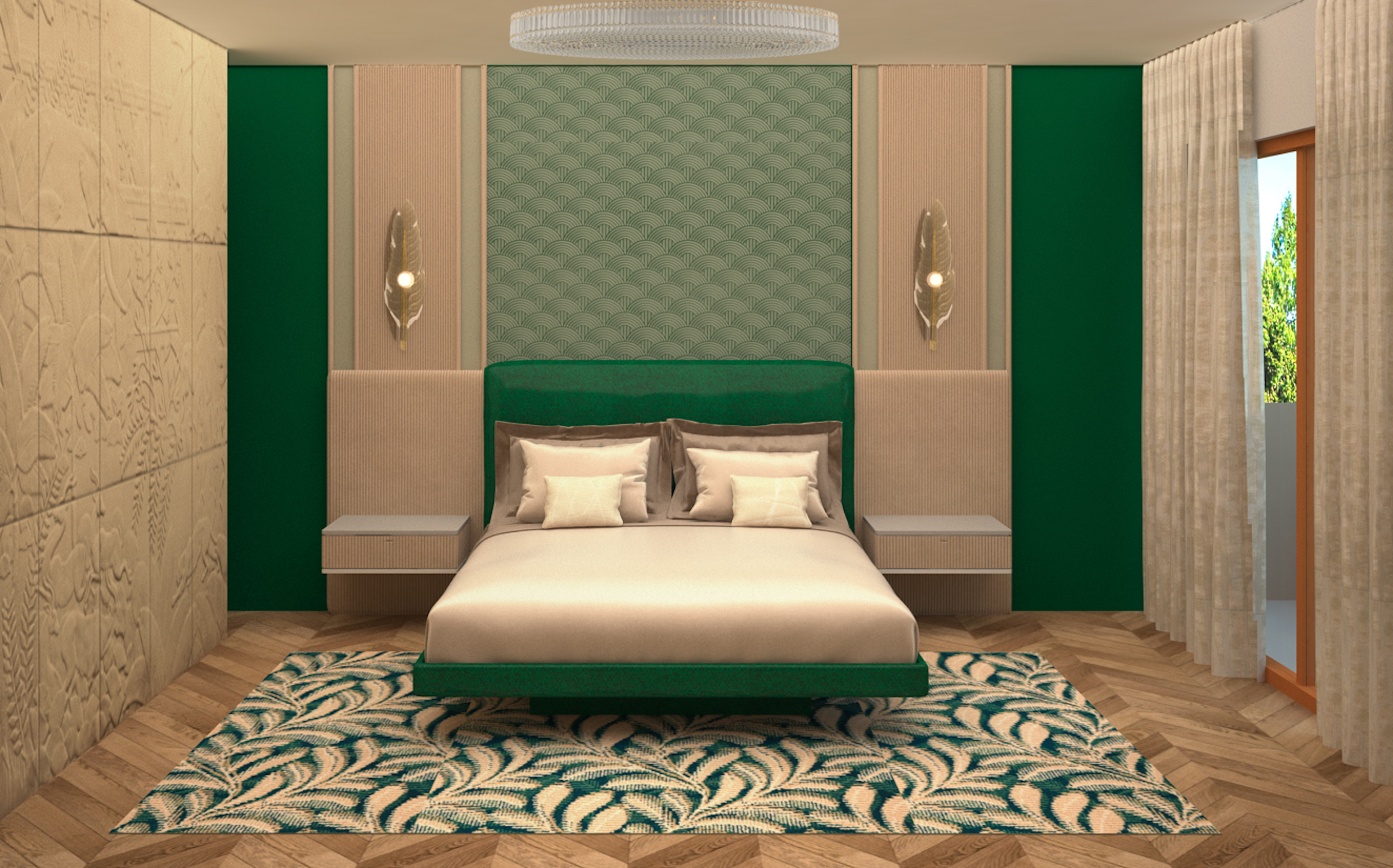 Anche in camera da letto torna il colore verde su pareti e arredi, tra cui il letto custom made realizzato da Loto Ad Project. Le due applique vintage a foglia in vetro incorniciano il letto, mentre i pannelli Babylon di Arte richiamano la Mesopotamia, culla della civiltà.
